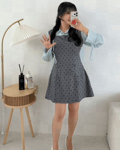 허리잘록 러블리무드 블루셔츠 도트 리본원피스