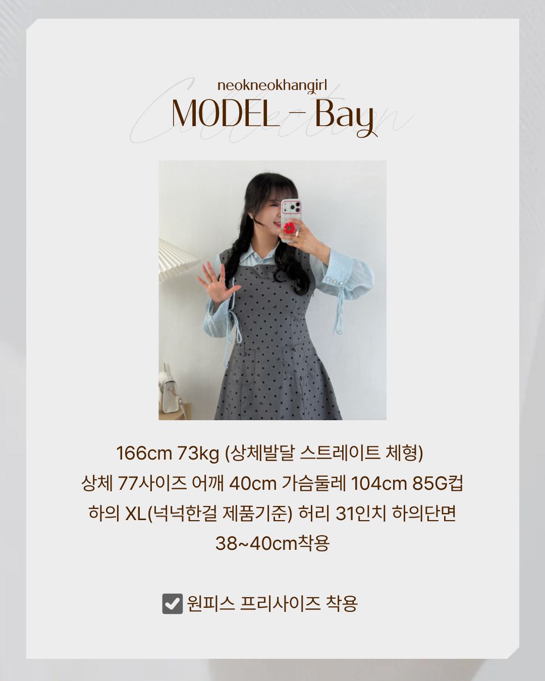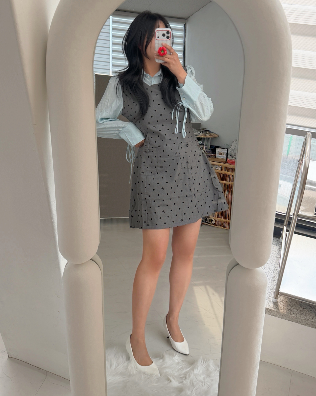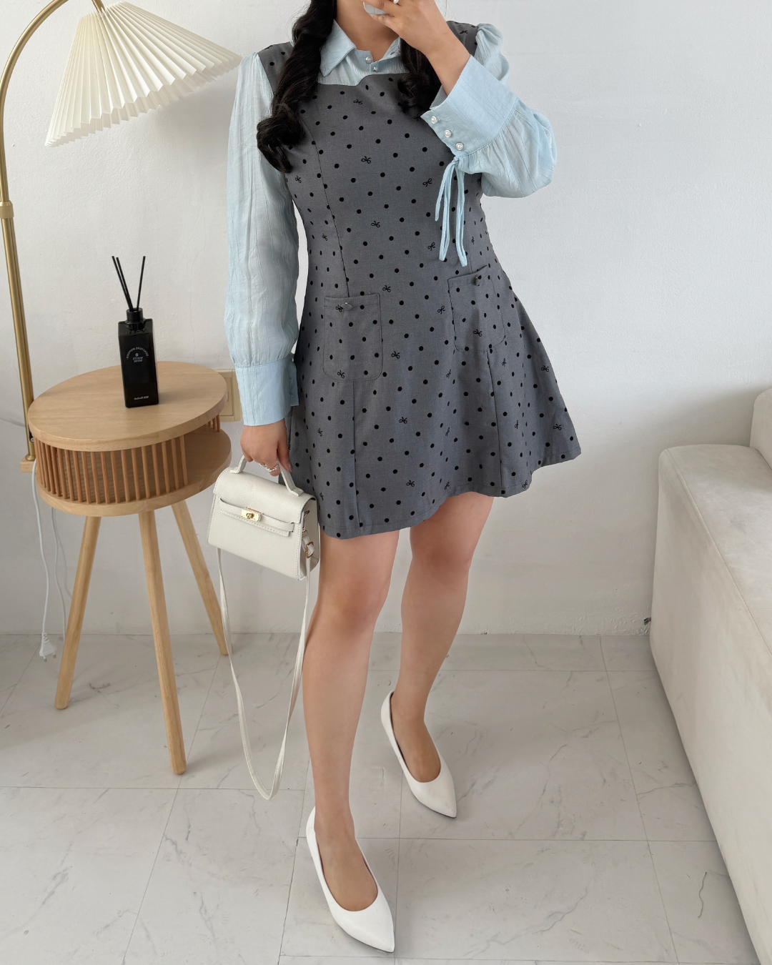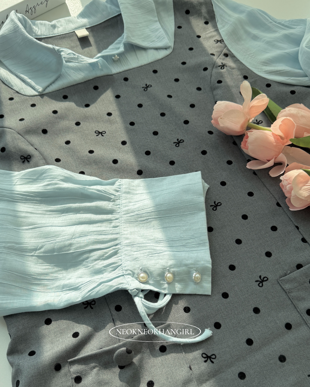 허리잘록 러블리무드 블루셔츠 도트 리본원피스